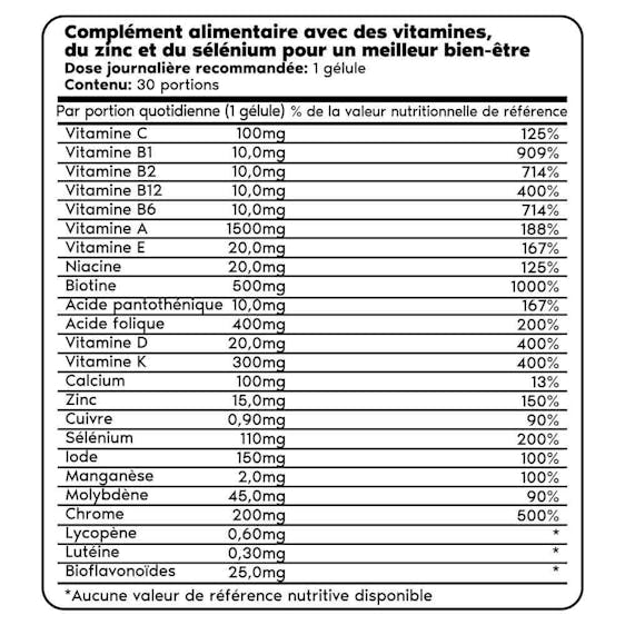 Multivitamin Complex te permet de couvrir facilement 100% de tes besoins quotidiens en vitamines et minéraux : avec seulement 1 gélule par jour